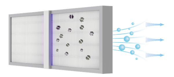 该技术系统是兼具空气过滤净化和杀菌消毒的复合型产品。当浑浊空气进入系统,HEPA级吸附阻隔过滤器将空气中的粉尘、颗粒、细菌、病毒等吸附拦截在滤网上,阻断其向空间扩散;移动扫描式静态杀菌消毒模块对高效过滤器幅面范围进行定时段、定幅宽静止照射,集中优势兵力将细菌病毒彻底灭杀。